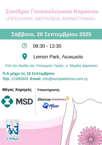 The Gynaecological Cancers' Conference, themed “Prevention, Treatment, Innovation”, will take place on September 20, 2025, from 08:30 to 13:30 in Nicosia, Cyprus and it is under the auspices of the Minister of Health, Mr. Michalis Damianou. The program includes opening remarks from policy makers, presentations on prevention and early diagnosis, surgical and therapeutic approaches to endometrial, cervical, and ovarian cancer, as well as discussions on personalised treatments, the role of artificial intelligence in cancer care, and fertility preservation in young patients. The conference concludes with a roundtable on improving women’s health outcomes through policy, education, and equal access to care.